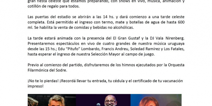 03.09.2021. El próximo domingo volvemos a alentar a la Celeste con un gran espectáculo desde las 14 horas. Marcelo Calistro3 septiembre, 20210
